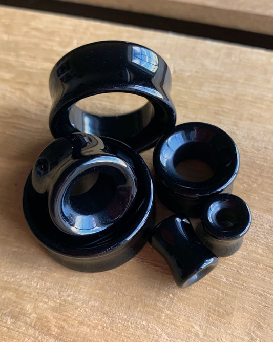 PAIR of Brilliant Black Agate Organic Stone Tunnels- Gauges 2g (6mm) to 1&1/2" (38mm)