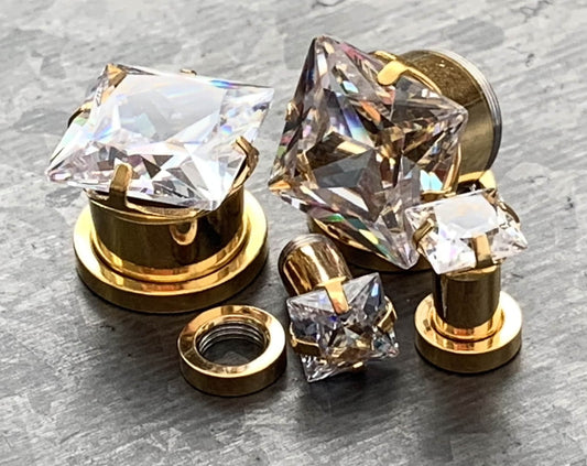 PAIR of Stunning Gold Large Square CZ Gem Steel Screw Fit Tunnels/Plugs - Gauges 8g (3.2mm) thru 1/2" (12mm)
