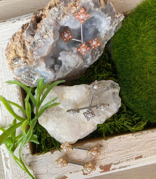 PAIR Pearl & Crystal Paved Flower Ends Nipple Rings Shields Vintage Barbells