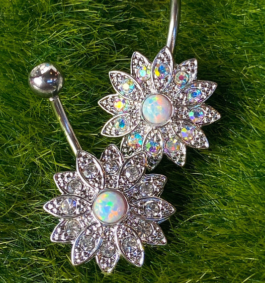 Paved Gems Flower Opal Belly Button Ring Pierced Navel IP 14kt Gold, Rose Gold