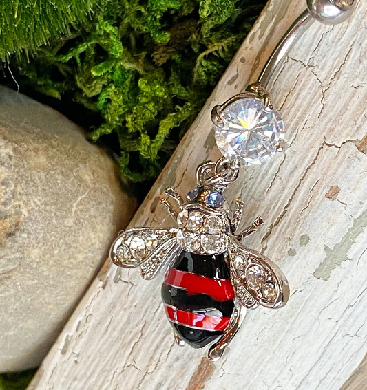 Red & Black Striped Bumble Bee Dangle Paved Gem Belly Ring Navel Naval