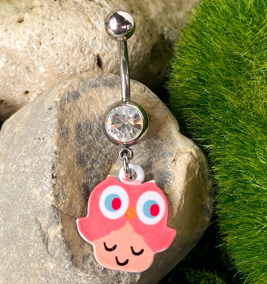 Pink Owl Dangle Clear Gem Belly Ring Navel Piercing Pierced Naval