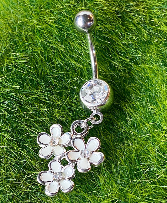 Triple Epoxy Flower CZ Gem Dangle Belly Ring Pierced Navel Pink, White