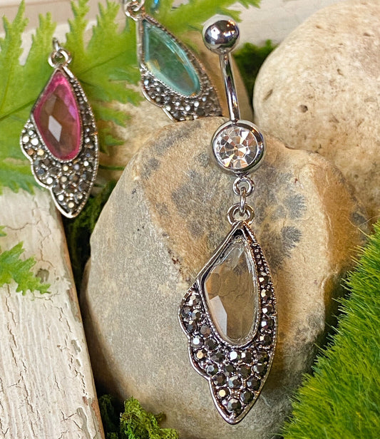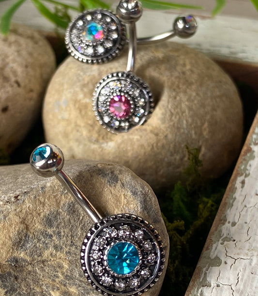 Vintage Shield CZ Gem Belly Ring Pierced Navel 14g Aurora Borealis, Pink, Aqua