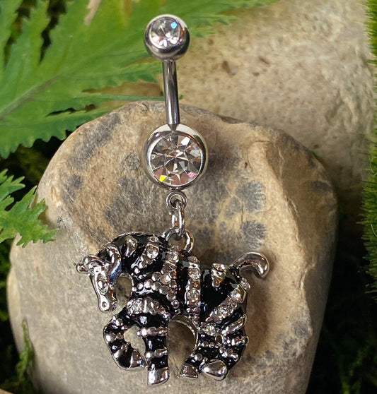 Zebra Black Enamel Paved CZs Striped Dangle Belly Ring Pierced Navel Print 14g