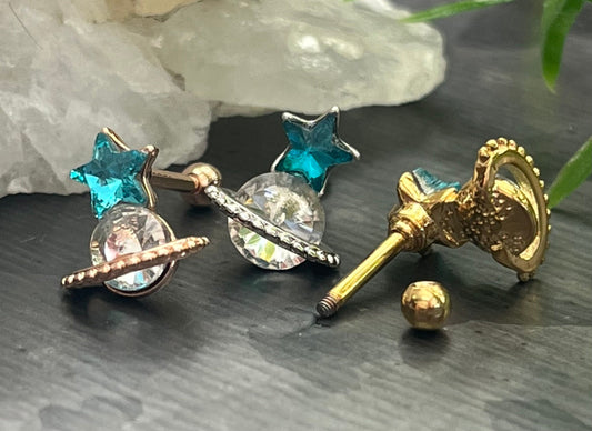 1 Piece Unique Crystal Star & Saturn Planet Tragus Barbell Stud - 16g - Wearable Diameter 1/4" (6mm)