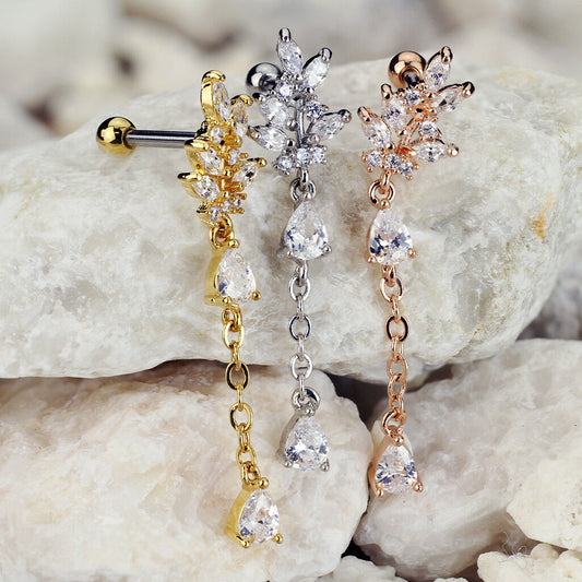 1pc CZ Gem Cluster Leaf w/ Chain Tragus Helix Cartilage Barbell Ring 16g 1/4"