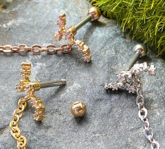 1pc CZ Gem Vine w/ Chain Tragus Helix Cartilage Barbell Ring 16g 1/4"