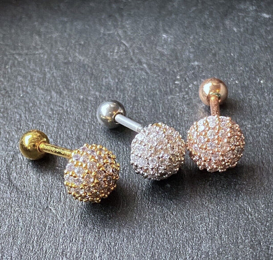 1pc Gem Paved Snowball Surgical Steel Tragus Cartilage Barbell Ring 16g 1/4"