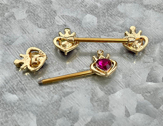 PAIR Gold Crown Fuchsia Heart Nipple Rings Surgical Steel Barbells Body Jewelry