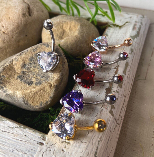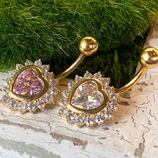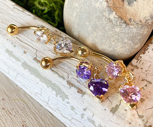 Gold Heart CZ Gem Belly Ring Navel Naval Clear, Pink, Tanzanite