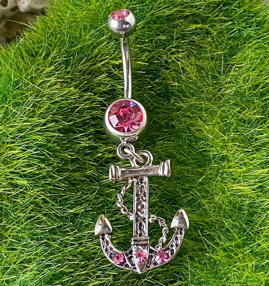 Anchor Dangle Belly Ring Pierced Navel Ship Nautical CZ Gem Clear, Pink, Aqua
