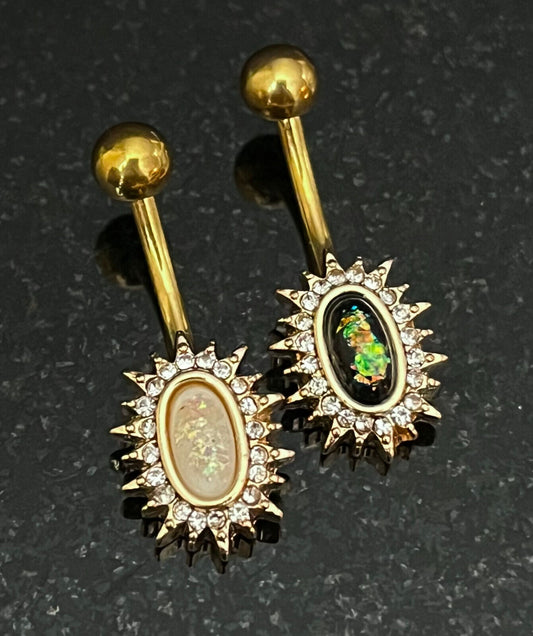 Crystal Paved Oval Sunburst Belly Ring Opal Glitter Center Naval Piercing Navel