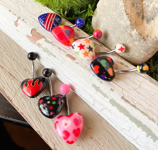 Acrylic Heart Belly Ring Navel Naval Print Black,White, Pink, Blue Stars Cherry