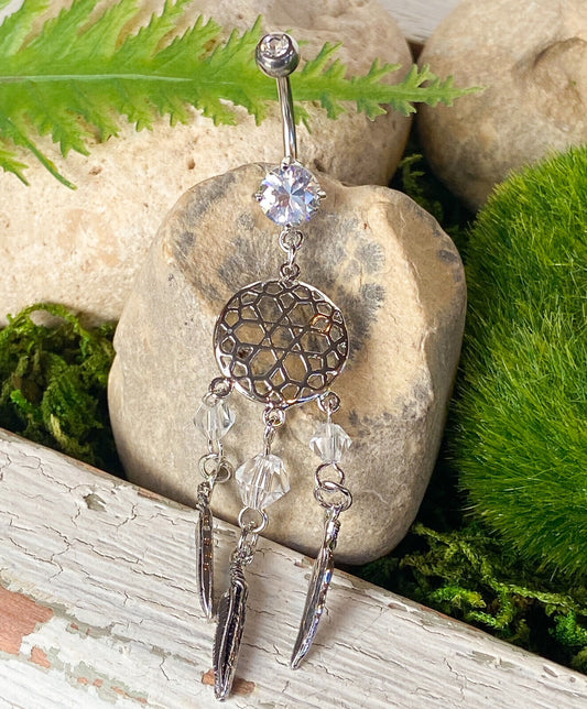 Dream Catcher Beaded Feather CZ Gem Belly Ring Pierced Navel Clear, Pink, Aqua