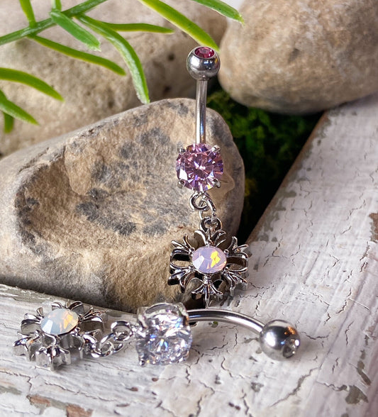 Triple Epoxy Flower CZ Gem Dangle Belly Ring Pierced Navel Pink, White