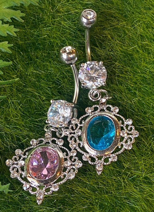 Reverse Chandelier CZ Gems Ring Navel Naval Aurora Borealis, Pink, Tanzanite