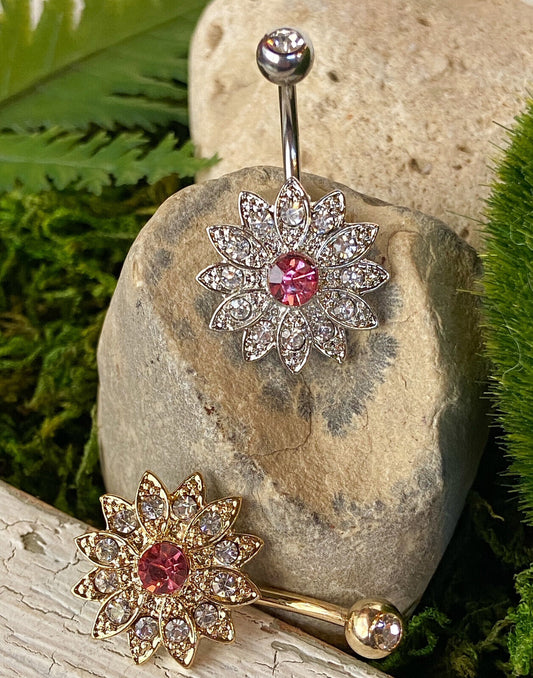 Flower w/ Center Crystal Paved Petals Belly Button Ring Pierced Navel
