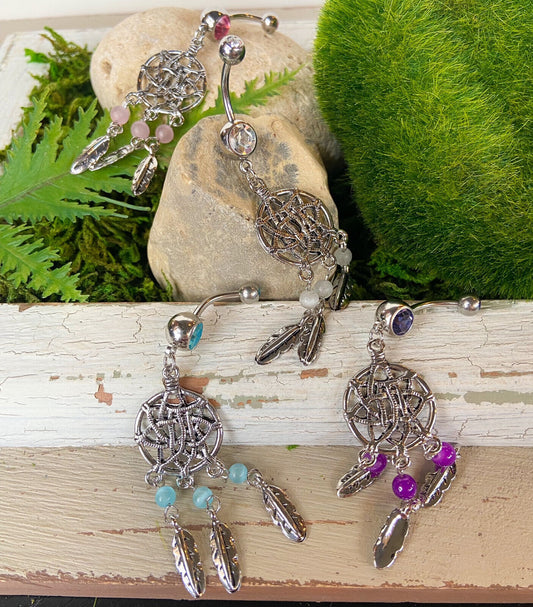 Dream Catcher Beaded Feather CZ Gem Belly Ring Navel Naval Clear, Pink, Aqua