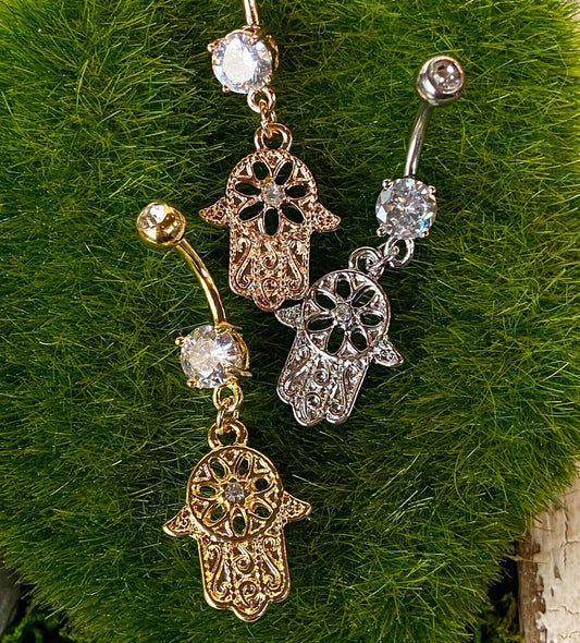 Beaded Outline Hamsa Belly Ring Gem CZ Dangle Pierced Navel Naval