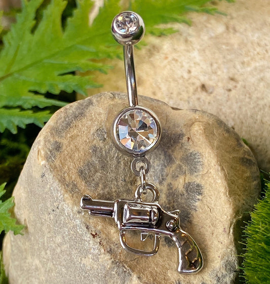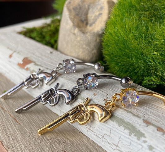 Gun Dangle Belly Ring CZ Gem Prong Set 316L Surgical Steel Pierced Navel