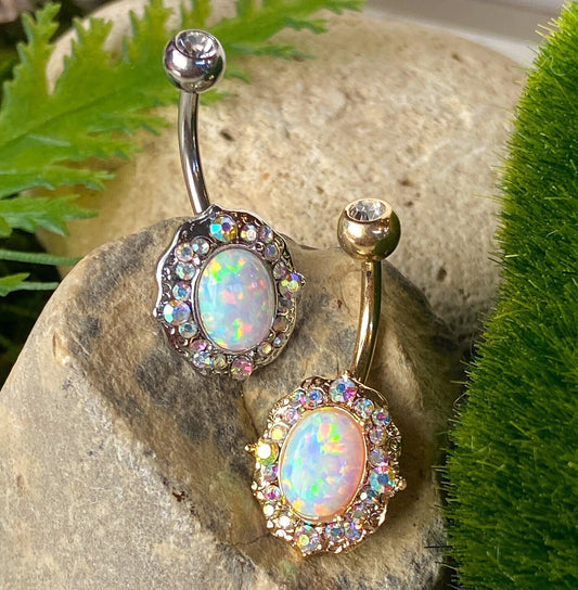 Opal Center Belly Ring Paved Aurora Borealis Gems Pierced Navel IP 14k Gold