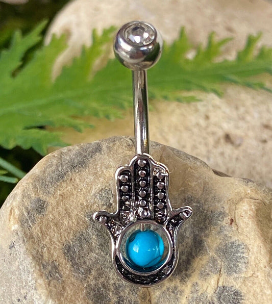 Hamsa Belly Ring CZ Gem Pierced Navel Naval Aqua Turquiose