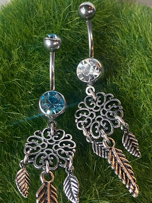 1pc Filigree Dream Catcher w/ Feather Dangles CZ Gem Belly Ring Navel Naval