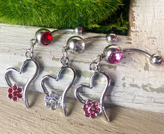 1pc Hollow Heart w/CZ Gem Paved Flower Dangle Belly Ring Navel Naval