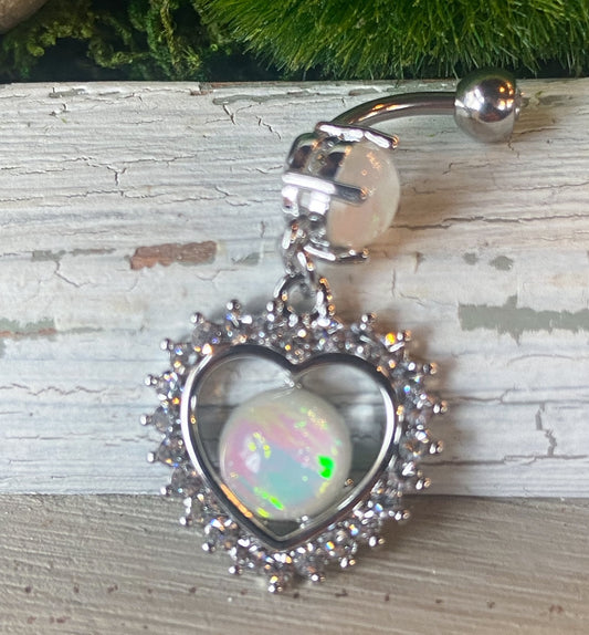 Opal Glitter Center Crystal Heart Dangle Belly Button Ring Navel Naval