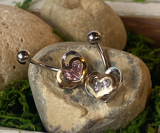 Gold and Steel Two Toned Double Heart with Gem Belly Ring Naval Navel