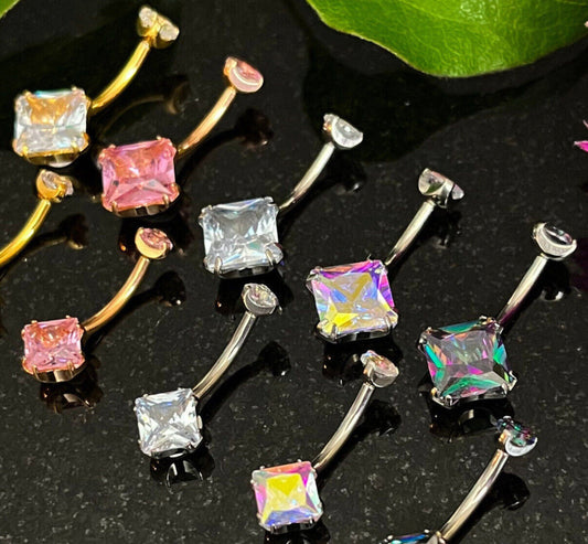 1 Piece Solid Implant Grade Titanium Square CZ Gem Navel/Naval Belly Ring - 14g