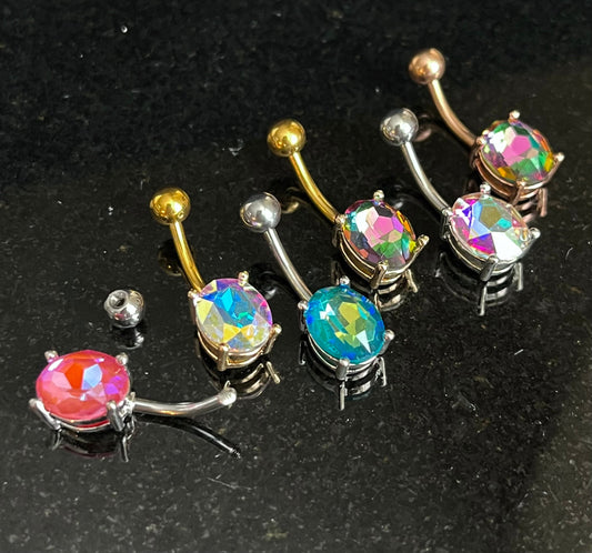 1 Piece Brilliant Prong Set Aurora Borealis Effect Oval Crystal Gem Navel/Naval Belly Ring - 14g
