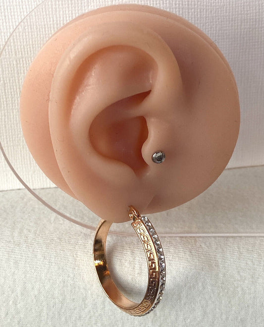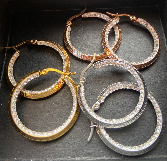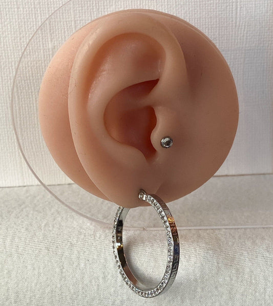 PAIR of Maze Hoop w/ Crystal Gem Paved Inner Edge Earrings 20g Stainless Steel