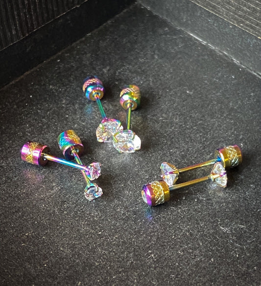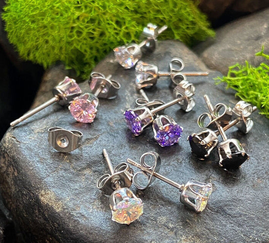 PAIR Prong Set CZ Gem Stud Rainbow Earrings w/ Gem Centered Screw Back Steel