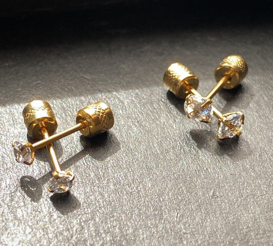PAIR Prong Set CZ Gem Stud Gold Earrings w/ Gem Centered Screw Back Steel