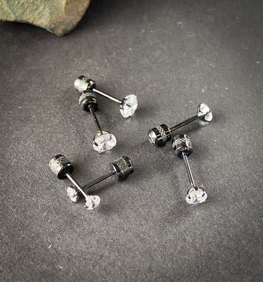 PAIR Prong Set CZ Gem Stud Black Earrings w/ Gem Centered Screw Back Steel