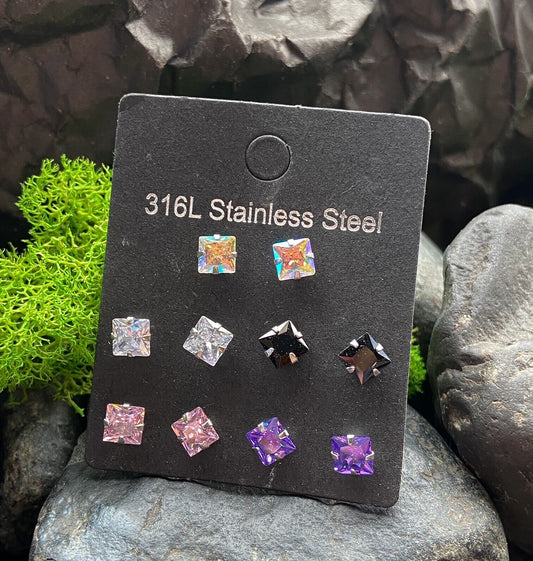 5 PAIRS Square CZ Gem Stud Earrings 316L Steel retail / display peggable card