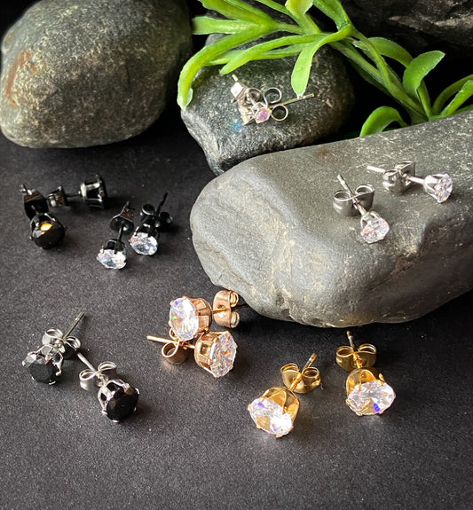 5 PAIR CZ Gem Stud Earrings 316L Stainless Steel retail / display peggable card