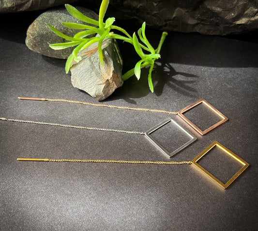 PAIR of Free Falling Chain Earrings w/ Bar & Open Square 20g Stainless Steel