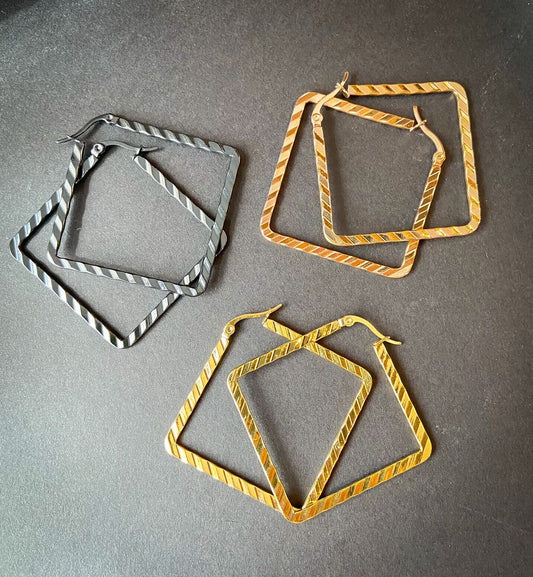 PAIR of Wave Pattern Square Hoop Earrings 22g Ion Plated Stainless Steel