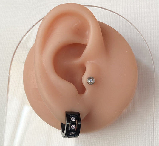 PAIR of Hoop Hinged Huggie Earrings 20g, 7mm Wide, 3 CNC Set CZ Gems