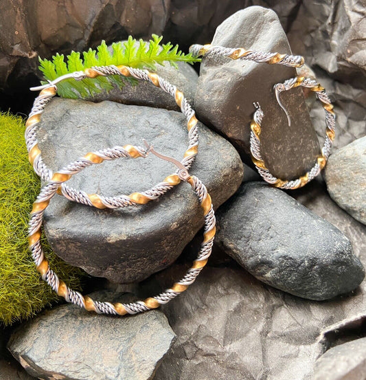 PAIR of Braided Twist Style Hoop Earrings 22g Gold Ion Plated Stainless Steel