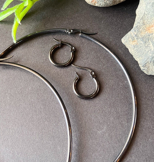 PAIR of Round Hoop Earrings 22g Black Ion Plated Stainless Steel