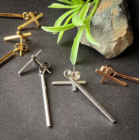 PAIR Cross & Long Bar Dangle Earrings 20g Butterfly Clasp Stainless Steel