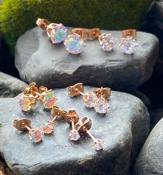 PAIR Rose Gold Ion Plated Steel Aurora Borealis or Clear CZ Gem Stud Earrings