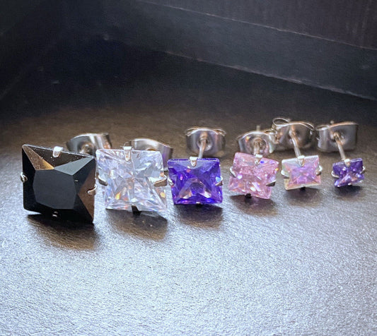 PAIR Square CZ Gem Stud Earrings 316L Surgical Steel, choose color and gem size