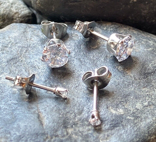 PAIR 316L Surgical Steel CZ Gem Stud Earrings, choose color & gem size