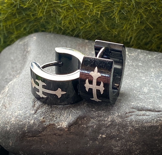 PAIR of Black Steel Hinged Wide Hoop Huggies Earrings w/ Gothic Medieval Cross