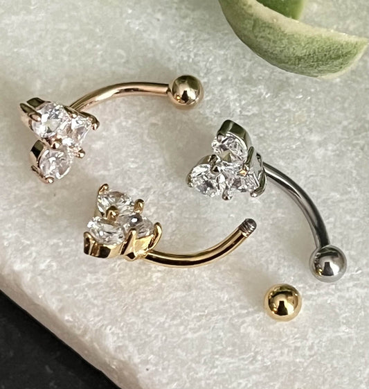 1 Brilliant Three CZ Gem Heart Eyebrow Ring with Curved Barbell - 16g (1.2mm), length 5/16" (8mm) - Silver, Gold or Rose Gold